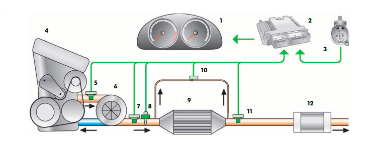 The overview shows a system with single exhaust pipe. On multi-pipe exhaust systems the particulate filter and the sensors on the exhaust system are installed for each set of cylinders.