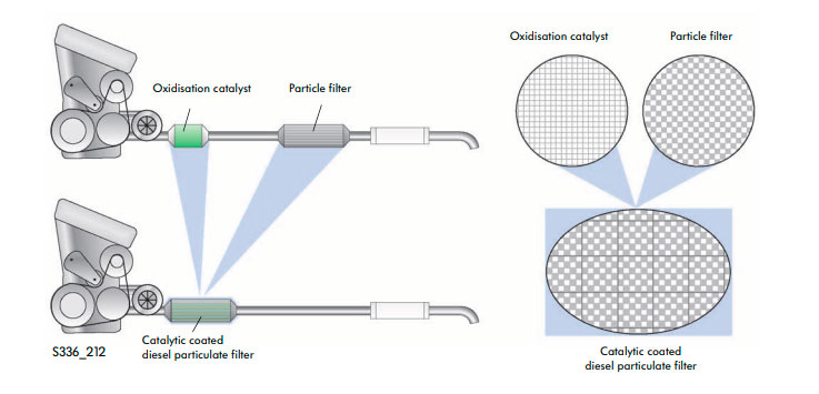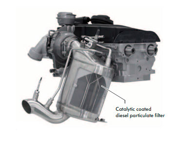 The catalytic coated diesel particulate filter is located in the exhaust system after the turbocharger, within close proximity of the engine. Two components, the oxidisation catalyst and the particulate filter, have been combined to form one unit, the catalytic coated diesel particulate filter. It joins the functions of the oxidisation catalyst and the diesel particulate filter in one single component.